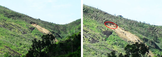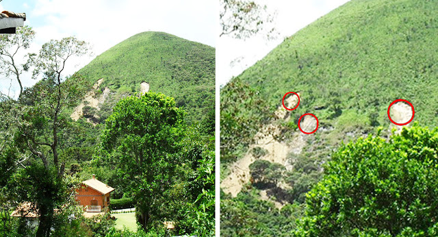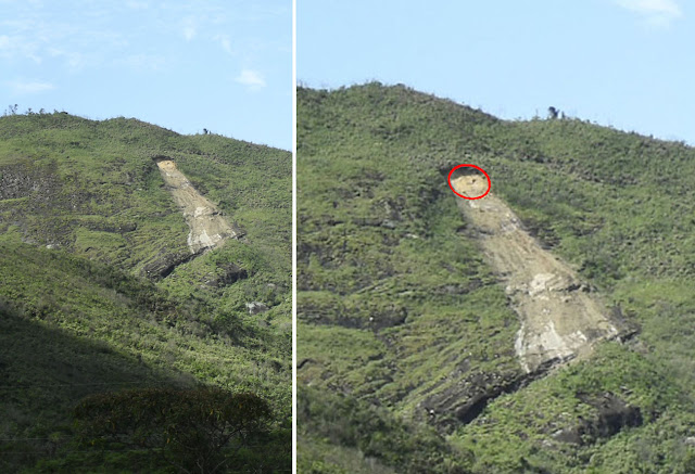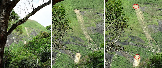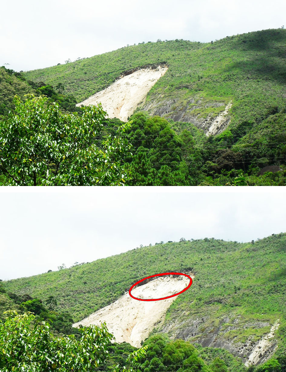 Ao sair de casa deparei-me com a devastação em todas as partes. Mas, o que me chamou a atenção foram as marcas nas montanhas, como se tivessem sido bombardeadas. Tirei fotos dos morros e posso comprovar que não são marcas de deslizamentos oriundos de excesso de água.